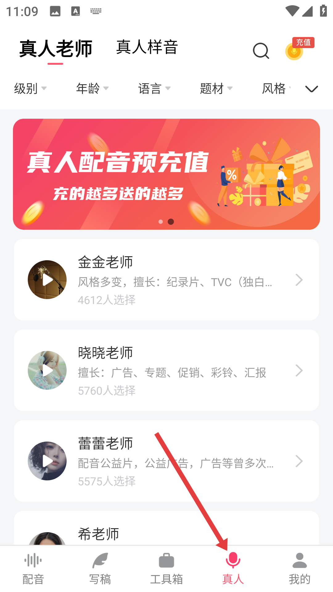 4、点击底部真人按钮,进入真人配音页面,这里有不同风格和专长的真人老师,可根据级别、年龄、语言等筛选,选择心仪老师进行真人配音预充值。