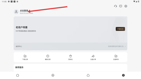 2、进入个人相关页面,看到点击登录提示,还有老用户特惠、会员中心等板块,点击登录。