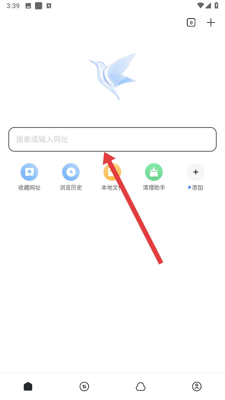 1、打开迅雷,进入主界面,能看到搜索或输入网址栏,还有收藏网址、浏览历史等功能入口,点击右下角按钮。