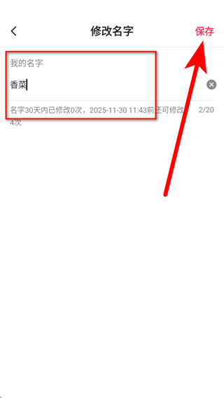 4、在修改名字页面,输入新的抖音名字后点击保存,即可完成抖音名字修改。